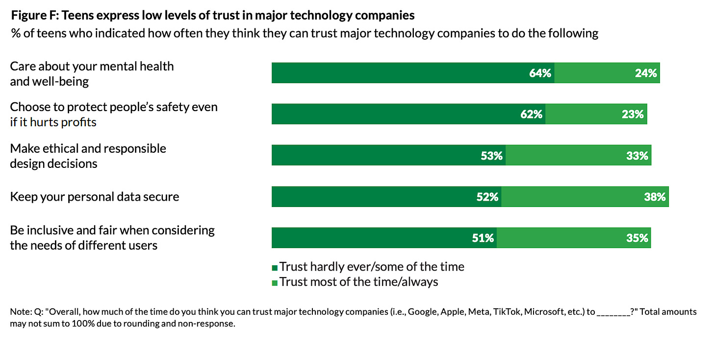 “Around 6 in 10 teens say that major technology companies (i.e., Google, Apple, Meta, TikTok, Microsoft, etc.) cannot be trusted to care about their mental health and well-being (64%) or to protect people's safety even if it hurts profits (62%).”